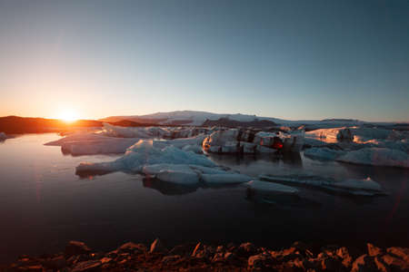 Icebergs floating in Jokulsarlon glacier lagoon lake at sunset. Great tourist attraction in Iceland Gold Circle.