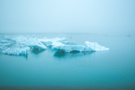 Glaciers covered with dense fog in the blue waters of Jokulsalron glacial lake in Iceland