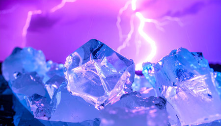 A powerful display of nature's fury as a vibrant purple lightning storm crackles in the sky above a field of frozen ice cubes.