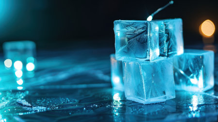 A stunning arrangement of illuminated ice cubes sits against a soft bokeh background, creating a magical and refreshing ambiance, perfect for food and drink themes.