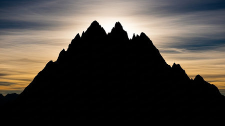 Dark, jagged mountain peaks silhouetted against a dramatic, ethereal light source, creating a moody and atmospheric landscape.