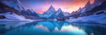 Snowy mountain peaks create serene reflections in crystal clear lake water at sunrise