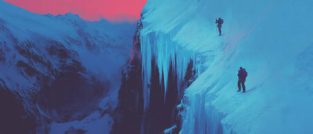 Adventurous ice climbers scale a frozen waterfall in a stunning winter landscape