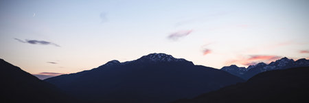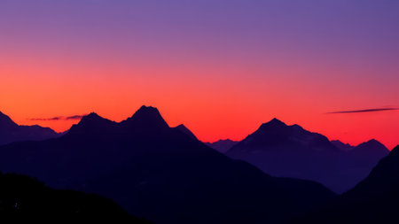Breathtaking Mountain Range at Dusk with Purple Silhouettes and Vibrant Horizon, Nature s Artistry