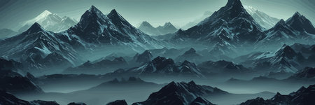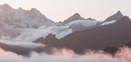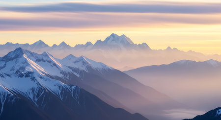 Experience the serene beauty of majestic mountain ranges at dawn, enveloped in mist, showcasing a breathtaking landscape with layered peaks and soft glow.