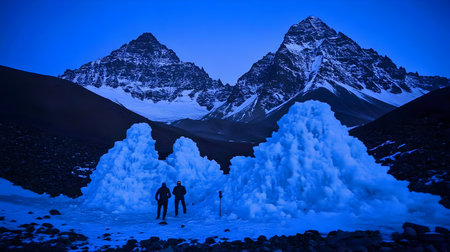 A group of hikers stands at the mountain's edge, silhouetted against the backdrop of snow-capped peaks. The captivating landscape inspires adventure and exploration.