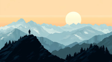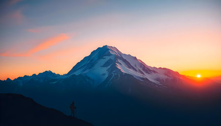 Hiker overlooking a majestic mountain range at sunrise - ai