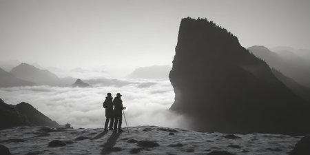 A captivating scene showcasing a group of hikers in misty mountains. The stunning landscape combines adventure and nature, presenting a moment of exploration and connection with the wilderness.