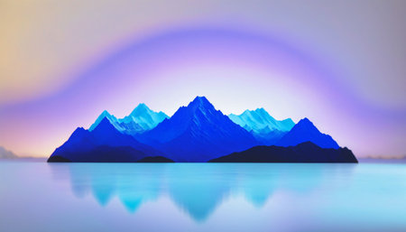 A tranquil silhouette of a man shines gently, surrounded by stunning mountains bathed in twilight glow. The scene captures harmony between the individual and nature's grandeur.