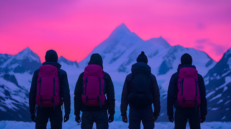 Four silhouetted figures with backpacks stand facing snow-capped mountains against a vibrant pink sky. The serene landscape evokes a sense of adventure and camaraderie in nature.