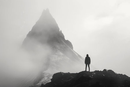 Man silhouette standing in front of mist-shrouded mountain peak in the fog. Back view of solitary traveler in nature
