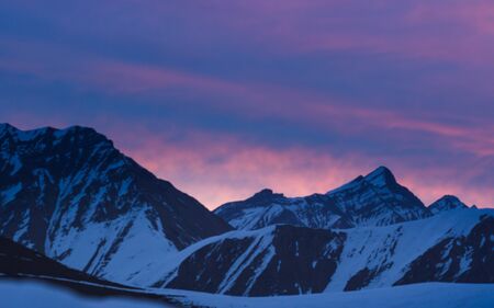 Mountain landscape with snow covered peaks at sunset. Colorful sky.