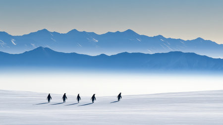 Stunning image of penguins walking gracefully across a snow-covered field with mountains in the background, showcasing the serene beauty of a winter landscape.