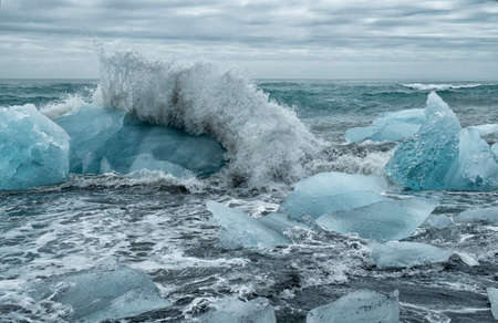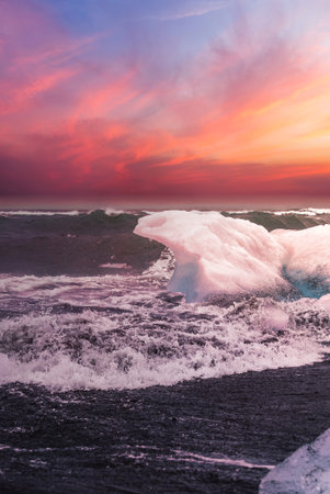 Chunks of ice from the Glacial lagoon in iceland on a black volcanic ash beach. Ice is slowly melting in the ocean waves as they crash on them relentlessly