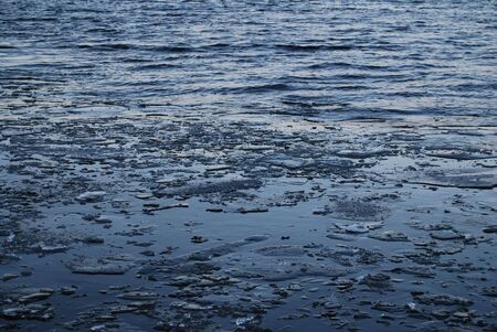 Many pieces of melting ice in dark blue water of river in at the end of the winter