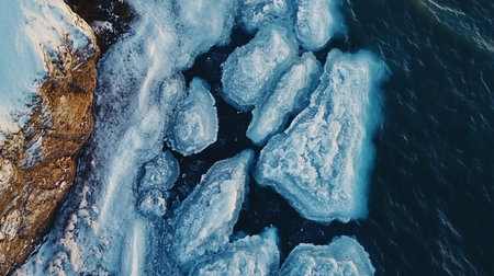 Ice floes on the water surface of the lake. Aerial top down view. Baikal lake, Siberia, Russia. Abstract nature background