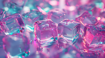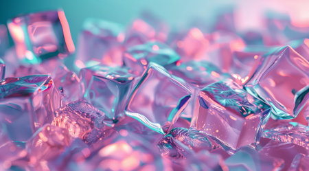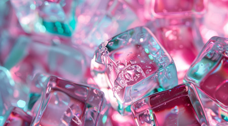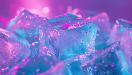 A detailed closeup of sparkling ice cubes bathed in pink and blue light, creating an enchanting visual appeal
