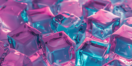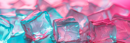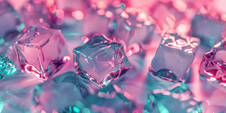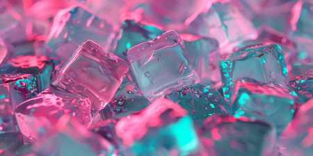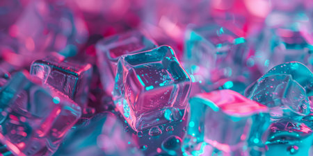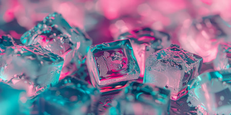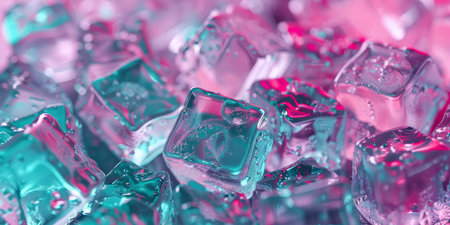 Vibrant ice cubes, beautifully illuminated with pink and teal colors, creating a stylish and refreshing visual effect