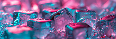 Closeup of sparkling ice cubes reflecting bright neon pink and blue hues, enhancing the captivating visual experience