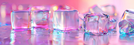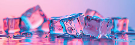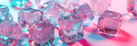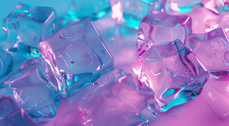 Melting ice cubes on reflective surface glow in pink and blue light, creating a cool abstract background with vibrant colors and textures. Perfect for a refreshing visual experience