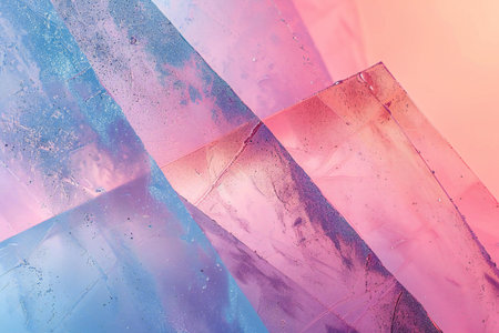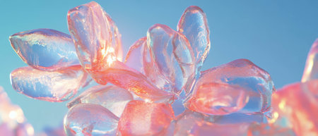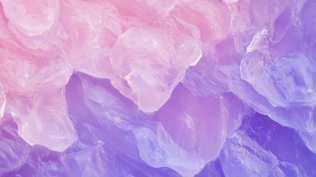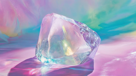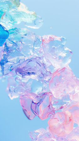 A captivating arrangement of abstract ice cubes features a gradient backdrop transitioning from light hues. The optical clarity of the ice contrasts beautifully with the softly illuminated colorful background, creating an ethereal atmosphere. Water droplets enhance the visual appeal, adding a refreshing touch to the overall composition.