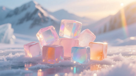 Glistening, translucent cubes in vibrant pastel shades sit on a frosted landscape, bathed in the soft glow of a winter sunset, evoking a serene and mystical arctic scene