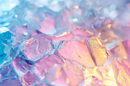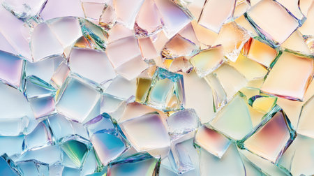This image showcases a vibrant arrangement of shattered glass pieces in pastel hues, reflecting light and creating an intricate abstract background ideal for artistic projects.