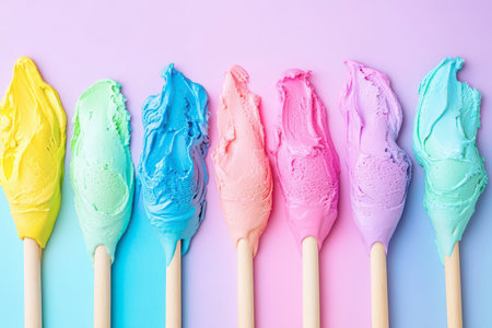 Seven vibrant scoops of ice cream in pastel shades are arranged on wooden sticks against a smooth pastel background.