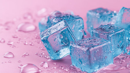 A detailed shot of blue ice cubes with glistening water droplets on a pink background, emphasizing a cool and modern aesthetic.