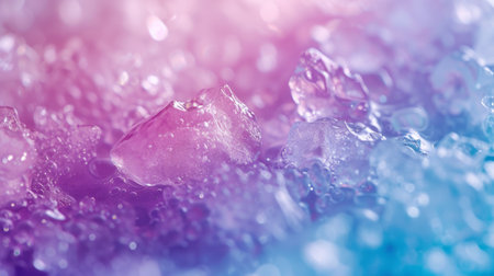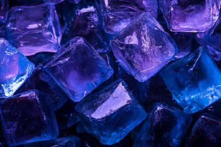 A close-up of ice cubes, glowing in vibrant shades of blue and purple with hints of pink and white, creating an otherworldly atmosphere. The colors create a dreamy effect as they reflect off the icy surface, adding depth to the scene. Soft lighting highlights their intricate textures, while subtle water droplets add a touch of realism. This image is perfect for conveying coolness or beauty associated with frozen drinks or food items. --ar 53:30 --v 6.1 Job ID: ec875935-3794-48fc-aebc-fc32686dcde1