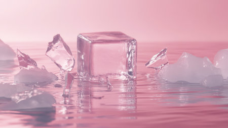 A serene composition featuring a clear ice cube and crushed ice set against a soft pink background. The reflective surface adds to the aesthetic appeal, ideal for various design projects.