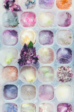 Frozen Flowers in Ice Cubes on Light Background, floral ice