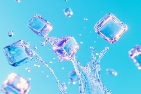 Floating ice cubes splash water in captivating arcs against a striking blue backdrop, showcasing a lively and refreshing atmosphere.