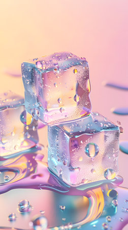 The composition features a collection of ice cubes glistening on a reflective surface. Soft gradients of light create an ethereal background, enhancing the translucent quality of the cubes. Water droplets add a dynamic element to the scene.