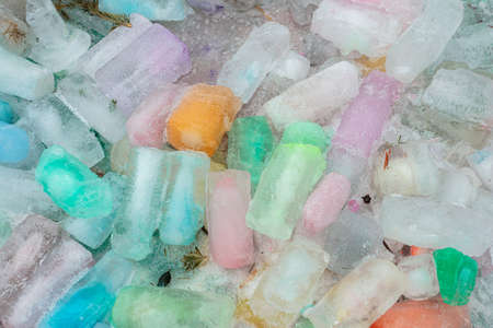 Crystals of colorful ice cubes background. Bright shiny icy surface
