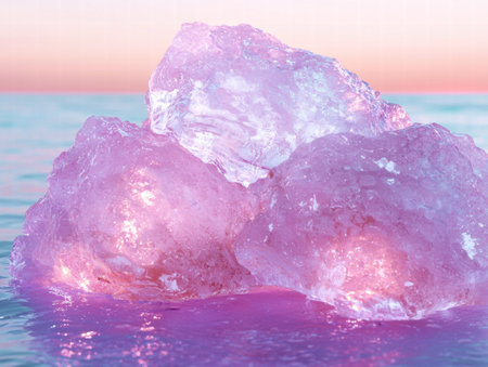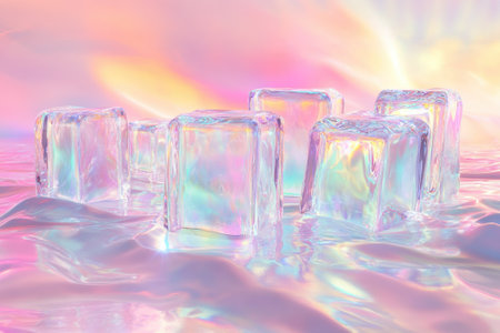 Ice cubes rest on a reflective surface, glowing with pastel hues in a dreamy setting during early morning.
