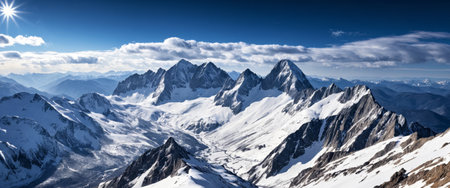 Majestic snowy mountain range under clear blue sky with sunburst.