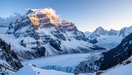 Majestic snow covered mountains rise above serene winter landscape with alpine trees