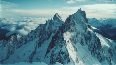 Stunning view of majestic snow-capped mountain peaks under a bright blue sky, showcasing the beauty of nature and evoking a sense of adventure and tranquility.