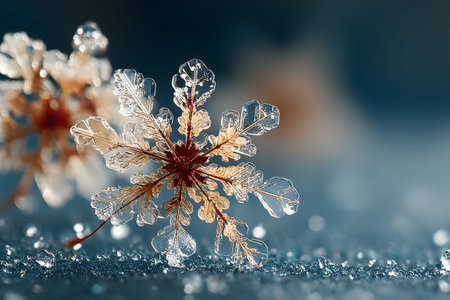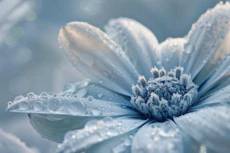 Close-up of beautiful frost-kissed flowers with intricate ice crystals, showcasing nature's delicate beauty in a cold winter morning. Soft bokeh background enhances the serene atmosphere.