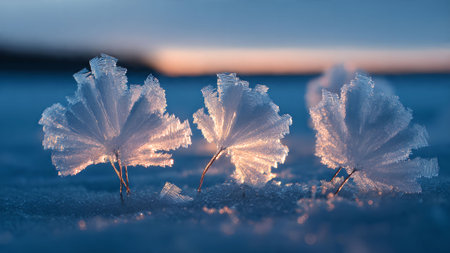 Delicate frost flowers bloom on a frozen surface, illuminated by the soft light of a winter sunrise. A serene, cold landscape.