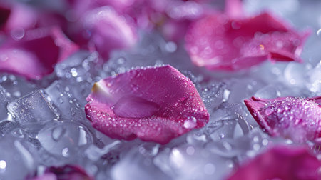 A closeup of an ice bath with floating rose petals and drops of lavender essential oil