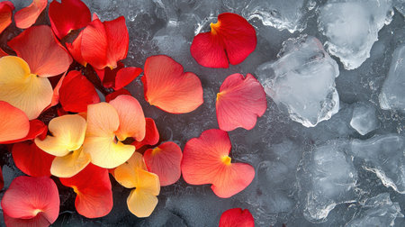 A striking display of vibrant rose petals in red, orange, and yellow on a bed of ice cubes, creating a refreshing and elegant atmosphere.