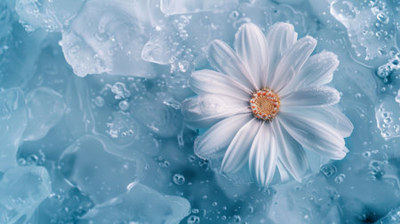 A white flower peacefully floats on top of a sheet of ice, its delicate petals contrasting with the frozen surface below. The flower appears to be frozen in time, creating a serene and captivating scene.