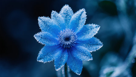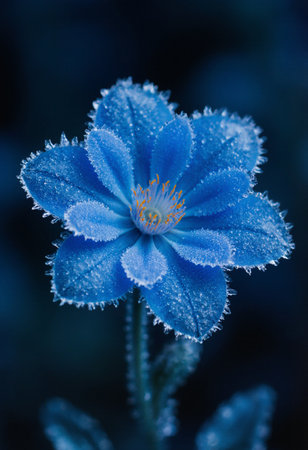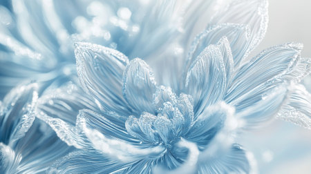 Delicate blue petals glisten with frost, showing intricate textures and patterns under soft winter light, creating a mesmerizing display of nature's beauty during the cold season.