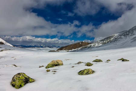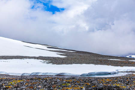 Galdhøpiggen snow-covered in summer in Jotunheimen Lom in Norway is the largest and highest mountain in Norway and Scandinavia with 2469 meters.