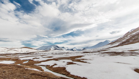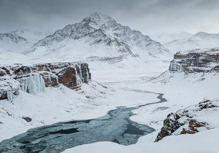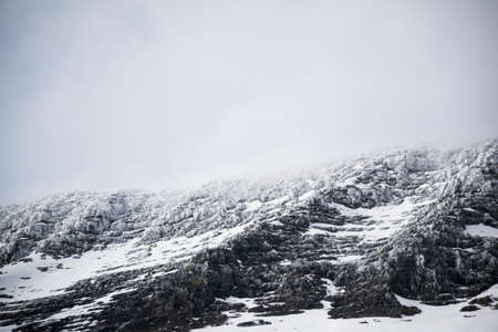 Snowy mountain peaks under brooding sky evoking cold beautiful melancholy