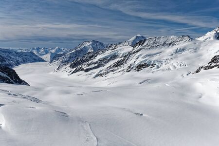 Great Aletsch glacier of Swiss and Bernese Alps and jungfrau snow mountain peak view from Jungfraujoch top of Europe with blue sky in summer background and copy space, Switzerland