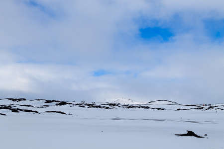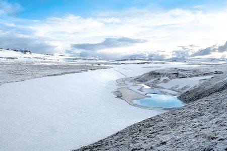 Beautiful winter landscape, panoramic view on the frozen lake and mountains covered with snow in the distance, amazing nature of Iceland