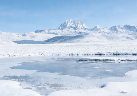 Beautiful winter landscape with snow-capped mountains and frozen lake